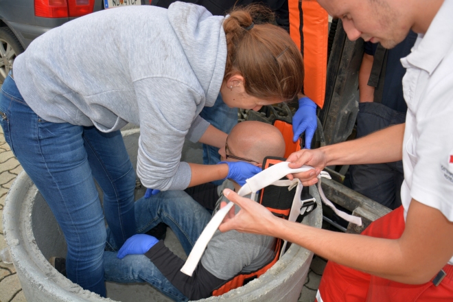 Das Zusammenspiel unserer Feuerwehr-Technik und den Medizinern wurde dabei anhand einer Schachtrettungen, einer eingeklemmten Personen unter einem Fahrzeug und die Rettung von einem Dach geübt. Die Vorgehens- und Arbeitsweise des Roten-Kreuzes war für uns neben der Handhabung und Umgang mit unserem eigenen Gerät bei dieser Übung sehr interessant und lehrreich. Nicht zuletzt muss die Zusammenarbeit im Ernstfall reibungslos funktionieren.