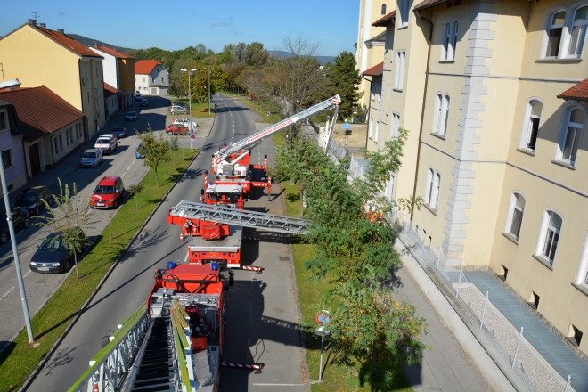 In Kittsee waren SEG’s aus allen Bezirken zusammengezogen worden und so standen circa 100 Mann im Einsatz. Übungsannahme war ein Brand in der Tagesklinik mit starker Verrauchung und in Konsequenz daraus eine Räumung der Tagesklinik. Die Feuerwehr Kittsee führte den Innenangriff durch und übergab unserer Drehleiter Patienten durch das Fenster im ersten Stock. Die beiden anderen hinzugezogenen Geräte arbeitetenden ebenfalls über den Hauptplatz.