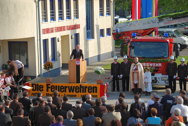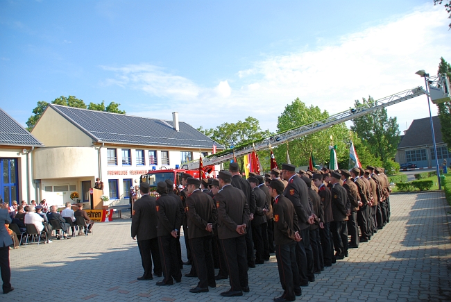 Die Ehrengäste Landeshauptmann Hans Niessl, Landesfeuerwehrkommandant Ing. Alois Kögl, Klubobmann Ing. Rudolf Strommer, Bezirksfeuerwehrkommandant OBR Johann Gombay, Bezriksfeuerwehrkommandant des Bezirkes Bruck an der Leitha OBR Franz Pinter, Bürgermeister Josef Ziniel, Bezirkshauptmann Mag. Martin Huber sowie Bezirksfeuerwehrinspektor BR Ronald Szankovich um nur einige zu nennen konnten bei bestem Wetter die Segnung unserer Drehleiter vor dem Feuerwehrhaus genießen.