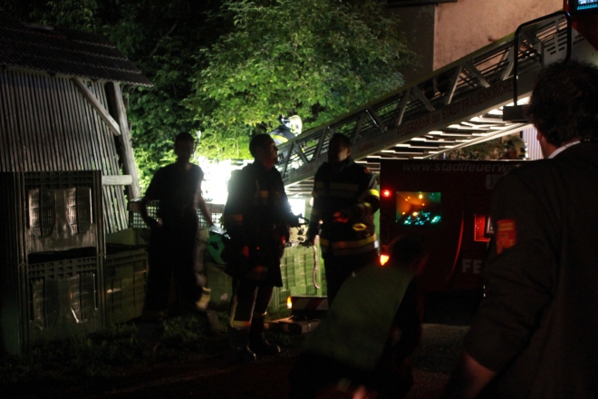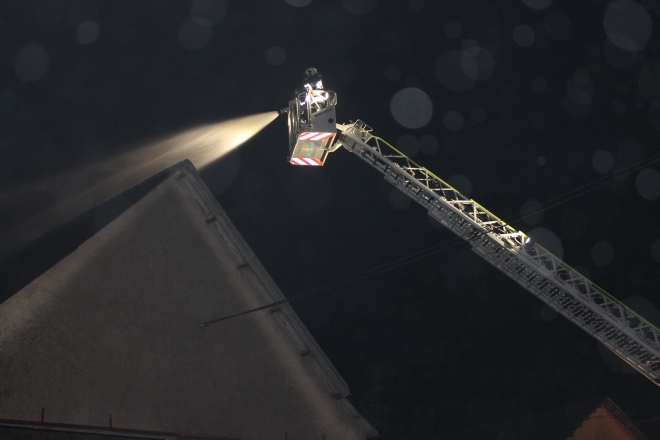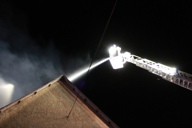Die Leiter wurde auf maximale Länge ausgefahren und die Löscharbeiten mit dem Monitor weitergeführt. Als alle Glutnester abgelöscht und die Brandstelle, ebenfalls von der Drehleiter aus, mit der Wärmebildkamera auf größere Temperaturunterschiede abgesucht war, rückte der Korb ab und setzte wieder auf festen Boden auf. Da es keine weiteren Befehle mehr für uns gab konnte zusammengeräumt und aus Pamhagen abgerückt werden.