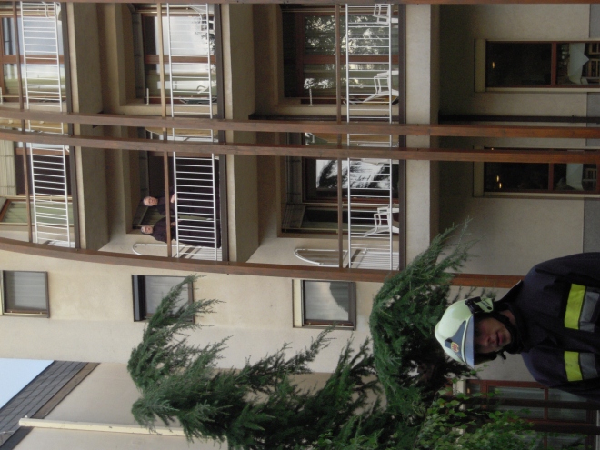 Der nächste Auftrag der Einsatzleitung für unsere Drehleiter war nun über das Hallendach zu fahren und die Neusiedler Teleskopmastbühne beim Löschen der zweiten Halle zu unterstützen. Dazu reduzierten wir die Korbbesatzung von zwei auf einen Mann, um die Auslegelänge zu erhöhen. Weiters musste sich unser Korbmaschinist, auf Anweisung der Einsatzleitung, mit Atemschutz ausrüsten um beim Überfahren des Hallendaches keine atemschädliche Stoffe einzuatmen.