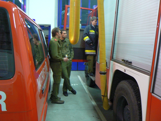 Atemschutzwart Josef Zwinger gab eine kurze Übersicht über die neue Ausbildung zum Atemschutzgeräteträger, bevor wir die richtige Ausrüstung und persönliche Schutzausrüstung eines Atemschutztrupps durchnahmen. Taktisches Vorgehen im Trupp mit Wärmebildkamera sowie die Türöffnungsprozedur mit Bandschlinge wurde durchgenommen. In der Fahrzeughalle wurde die richtige Versorgung der Atemschutzgeräte in den drei Fahrzeugen Rüstlöschfahrzeug, Löschfahrzeug und Drehleiter praktisch durchgenommen.
